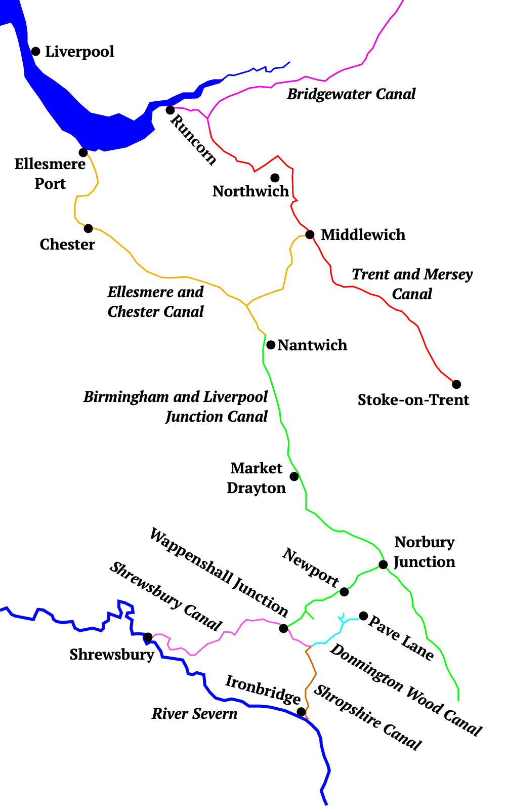- Donnington Wood Canal was completed in about 1767, running from the family’s coal mines in Donnington Wood through the Lilleshall area to Pave Lane on the turnpike road to Newport. It was linked to the national canal network via the Birmingham and Liverpool Junction’s Newport Branch, both via the Wombridge and Shrewsbury Canal, and the railway to Lubstree Wharf on the Humber Branch.